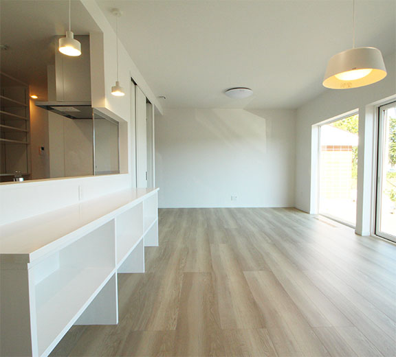 キッチンを中心にした間取りで天井が高く、開放感あるリビングからは目の前の公園を見渡せる大きな窓。