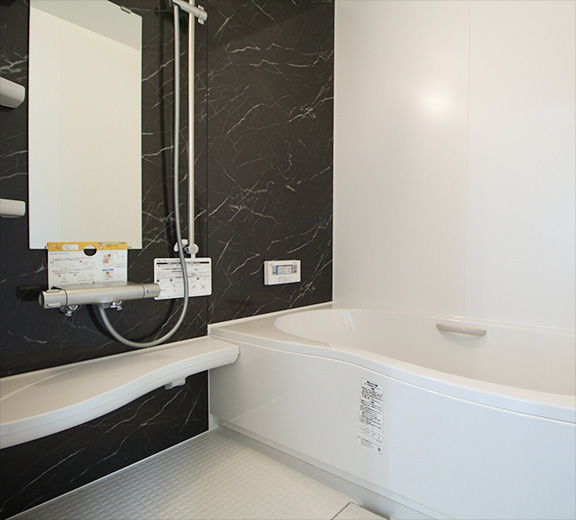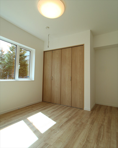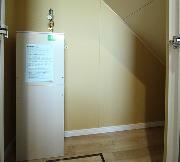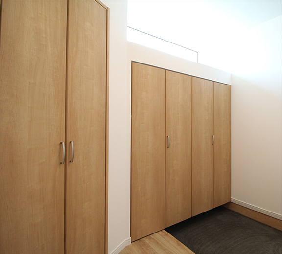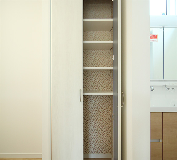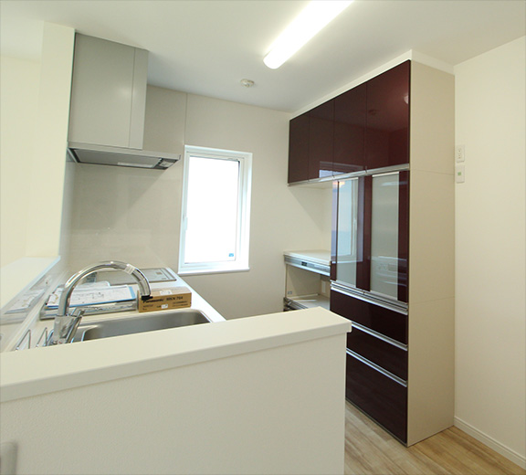 冷蔵庫置場を中心に、左にカップボード、右にパントリーにも使える収納スペースで使いやすくしています。
