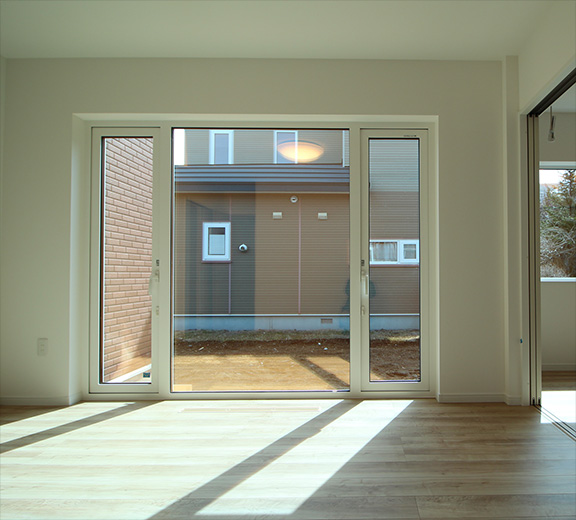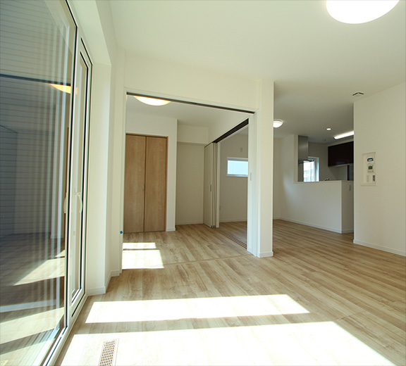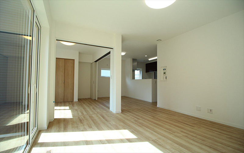 ママ楽回遊動線を採用したL字型のリビングダイニング+キッチン。