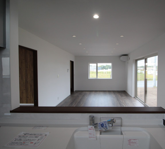 大きな窓から差し込む明るく、広々としたリビングが中心の家事ラク動線