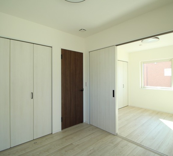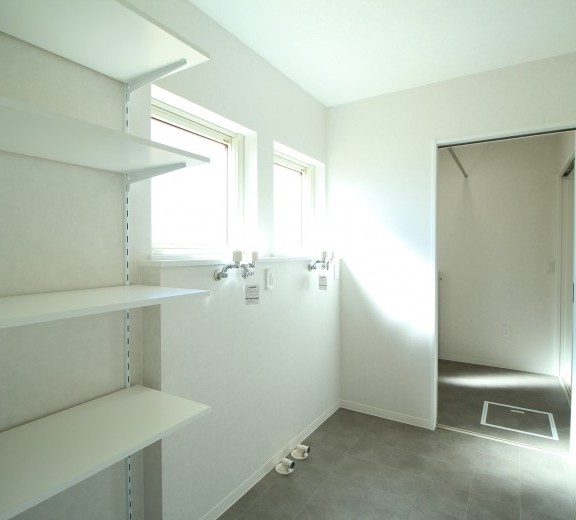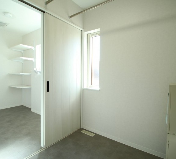 脱衣室の隣には、天気や時間を気にすることなく洗濯物が干せるランドリースペースを設けました。脱衣室に洗濯機スペースを設けているので、お洗濯をした後は横にスライドするだけで洗濯物が干せちゃう家事楽動線♪