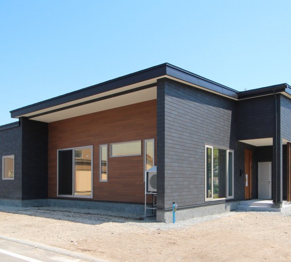 落ち着いたブラックの外壁が木の素材を引き立てます。