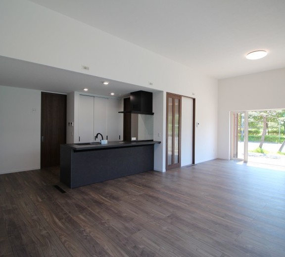 ■POINT|ワンフロアでゆったり暮らせる平屋の住まい。ブラックのキッチンで引き締まった重厚感のある空間を演出。