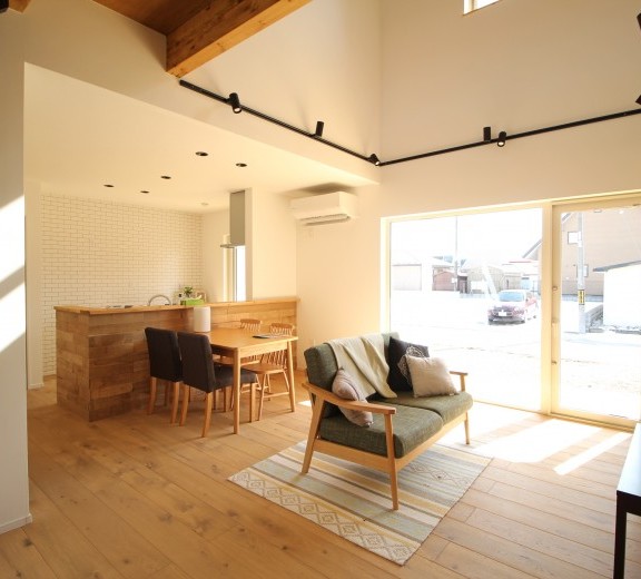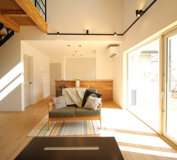 吹き抜けと大開口の組み合わせで開放感のある空間を演出。