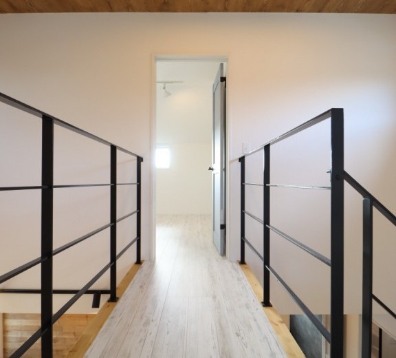 吹き抜けと鉄骨階段の組み合わせで開放感ある空間を創り出しています。
