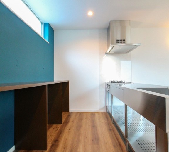 大開口から暖かな日差しを取り込む明るいキッチン。