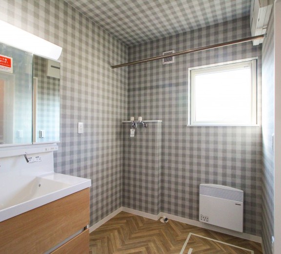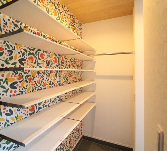壁紙が可愛らしいシューズクロークがお出迎え。