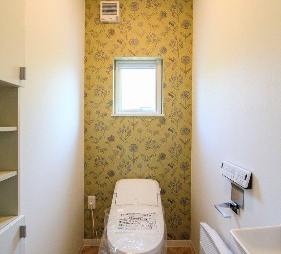 キッチンの壁紙がアクセントとなって締まって見えます。
